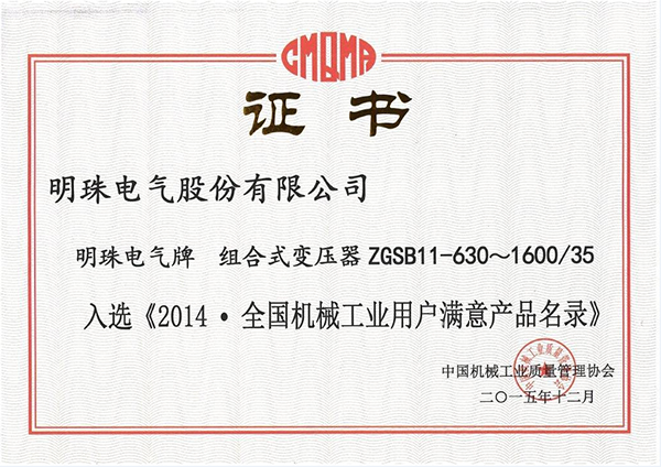 2015年12月22日,中國機(jī)械質(zhì)量管理協(xié)會(huì)召開會(huì)議,對(duì)百項(xiàng)全國機(jī)械工業(yè)用戶滿意產(chǎn)品獲獎(jiǎng)單位予以授獎(jiǎng),我公司組合式變壓器產(chǎn)品作為電工電器制造行業(yè)唯一同類產(chǎn)品獲授“全國工業(yè)機(jī)械用戶滿意產(chǎn)品”。