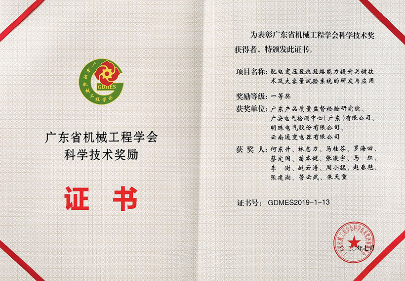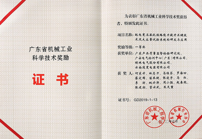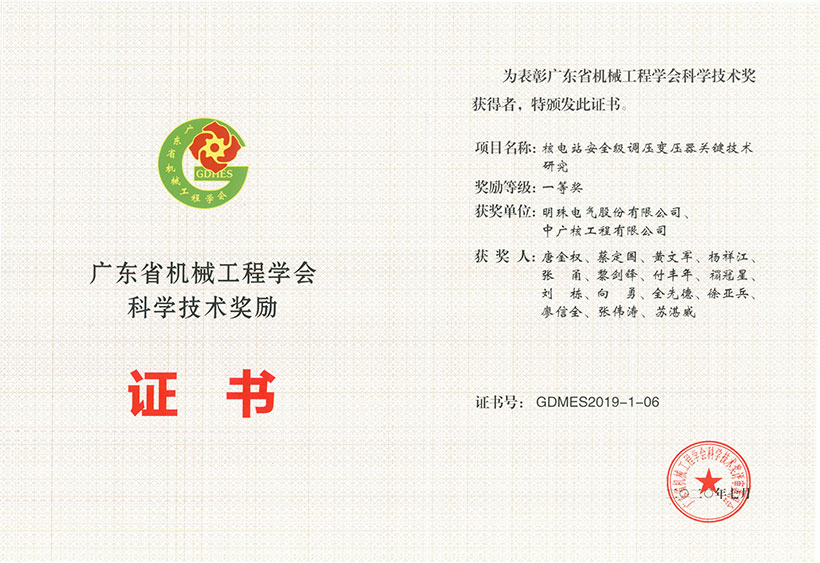 近日,明珠電氣“核電站安全級調(diào)壓變壓器關鍵技術研究”項目(與中廣核工程有限公司聯(lián)合開展)以及“配電變壓器抗短路能力提升關鍵技術及大容量試驗系統(tǒng)的研發(fā)與應用”項目(由廣東產(chǎn)品質(zhì)量監(jiān)督檢驗研究院主持),同時榮獲2019年度廣東省機械工業(yè)科學技術獎勵一等獎和2019年度廣東省機械工程學會科學技術獎勵一等獎。