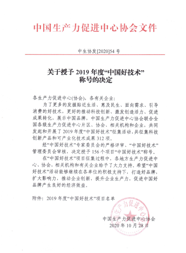“中國好技術(shù)”的評選,旨在把好創(chuàng)意變成好產(chǎn)品、把好產(chǎn)品變成好品牌、把好品牌推向市場、讓好品牌產(chǎn)生效益。此次開展的2019年度“中國好技術(shù)”征集活動(dòng),共有科技創(chuàng)新產(chǎn)品和可產(chǎn)業(yè)化技術(shù)成果共312項(xiàng),經(jīng)“中國好技術(shù)”專家委員會(huì)的嚴(yán)格評審、管理委員會(huì)審核,最終授予156個(gè)項(xiàng)目“中國好技術(shù)”稱號。