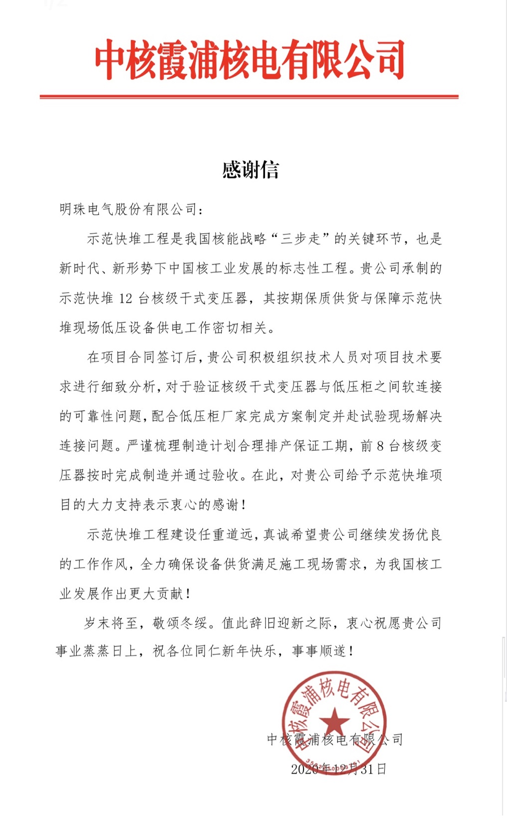2020年收官之際,明珠電氣收到來自不同客戶的感謝與表彰。中核霞浦公司感謝我司卓越的產(chǎn)品交付和技術(shù)服務(wù);國(guó)電南瑞授予我司2020年“優(yōu)秀供應(yīng)商”榮譽(yù)稱號(hào)。 客戶的贊賞就是每一位明珠人的高光時(shí)刻,我們感恩客戶給予的成長(zhǎng)機(jī)會(huì),也自豪于明珠人交出的一份份優(yōu)異答卷。