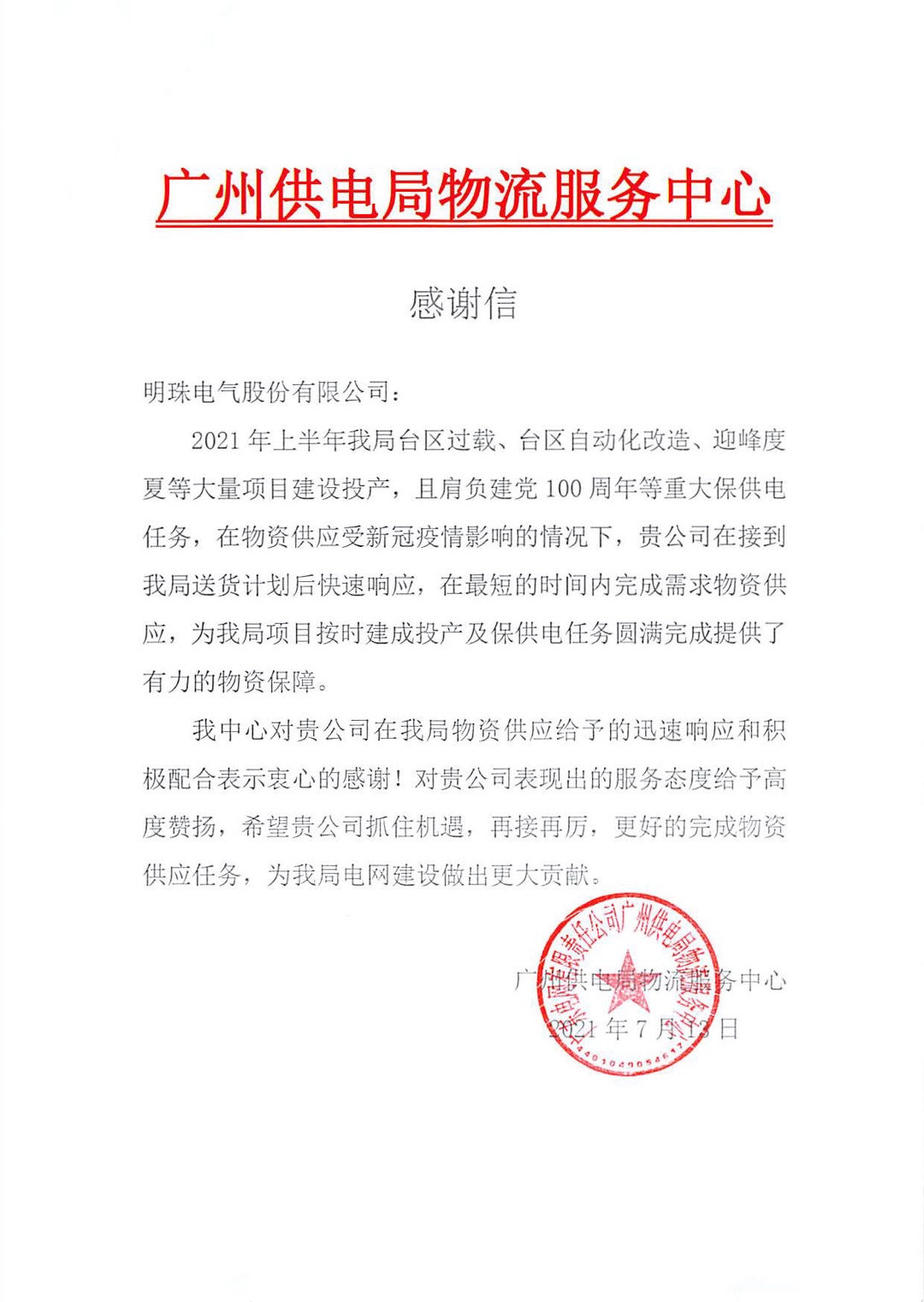在收獲中標(biāo)喜訊的同時(shí),明珠電氣也收到了廣州供電局的感謝信,對(duì)明珠在今年上半年供應(yīng)和服務(wù)中的迅速響應(yīng)積極配合予以高度贊揚(yáng)。明珠電氣將再接再厲,為廣大客戶提供更優(yōu)質(zhì)的產(chǎn)品與服務(wù)。